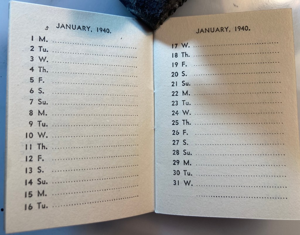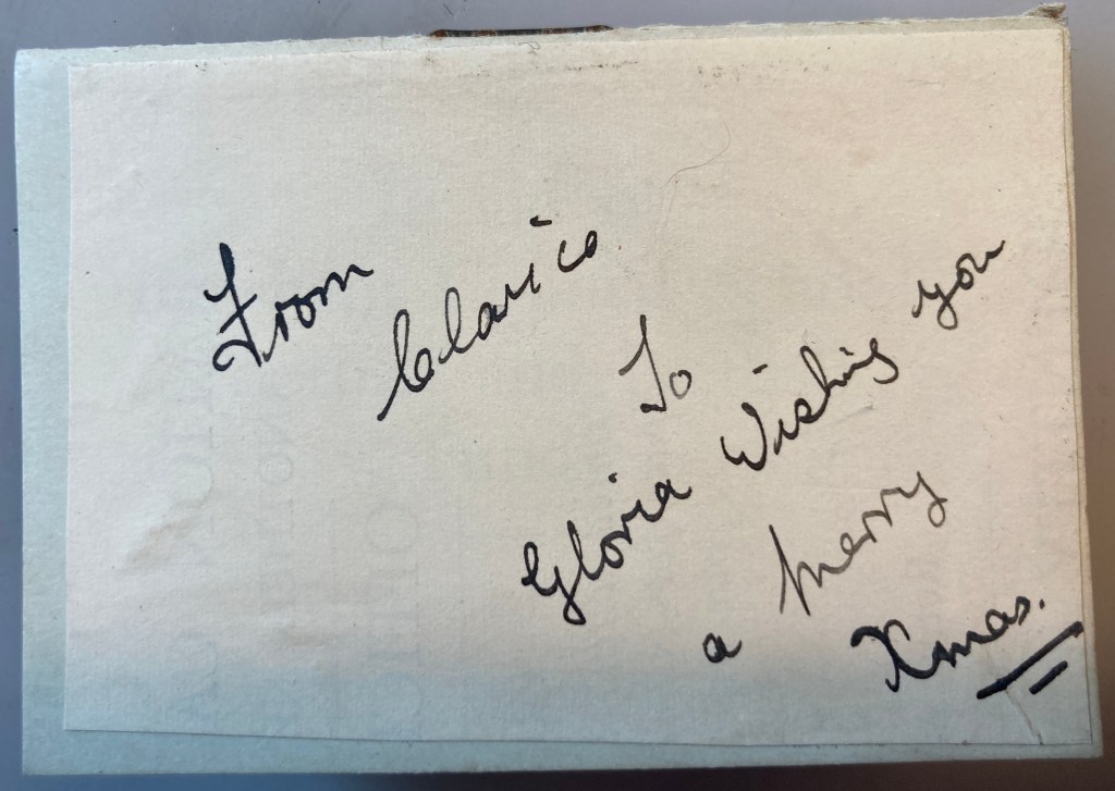 It declares: Upon your happy Birthday morn, I wish you Joy and Pleasure. And everything you’d like to have Heaped up in brimming measure! It has a spot for From at the bottom (what about To?) and someone has penciled in, as best I can tell, E. M. Pinder.