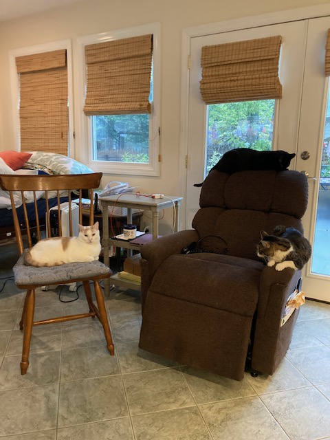 The reality of a house after living my entire adult life in one room, most recently spending all day and night in it with Kim and the cats throughout the pandemic. Although a small Cape Cod, I wander rooms now which seem too many and very quiet despite cats and televisions left on. I am used to either the bustle of our tiny apartment or nurses tucked into corners and recliner chairs here. I am comforted by the site of the flowers recently placed in planters on the deck and have moved my computer from the upstairs office to the kitchen where the cats are gathered on my mother’s chair. I think my friend had that in mind when she encouraged me to plant them recently.