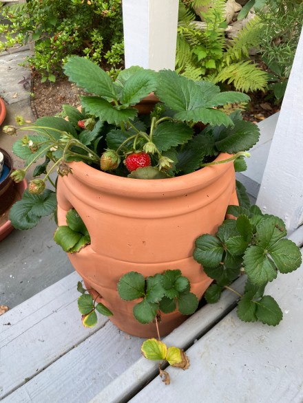 It is a week later as I write from New Jersey. Much going on in this small world. The strawberry plant, which I transplanted into this strawberry pot a month or so ago has produced its first strawberry!(Someone, my money is on a chip monk, stole it right out from under my nose however; I have yet to taste this bounty.) Multiple flowers however and a few in an early transitional state lead us to hope it isn’t the last.