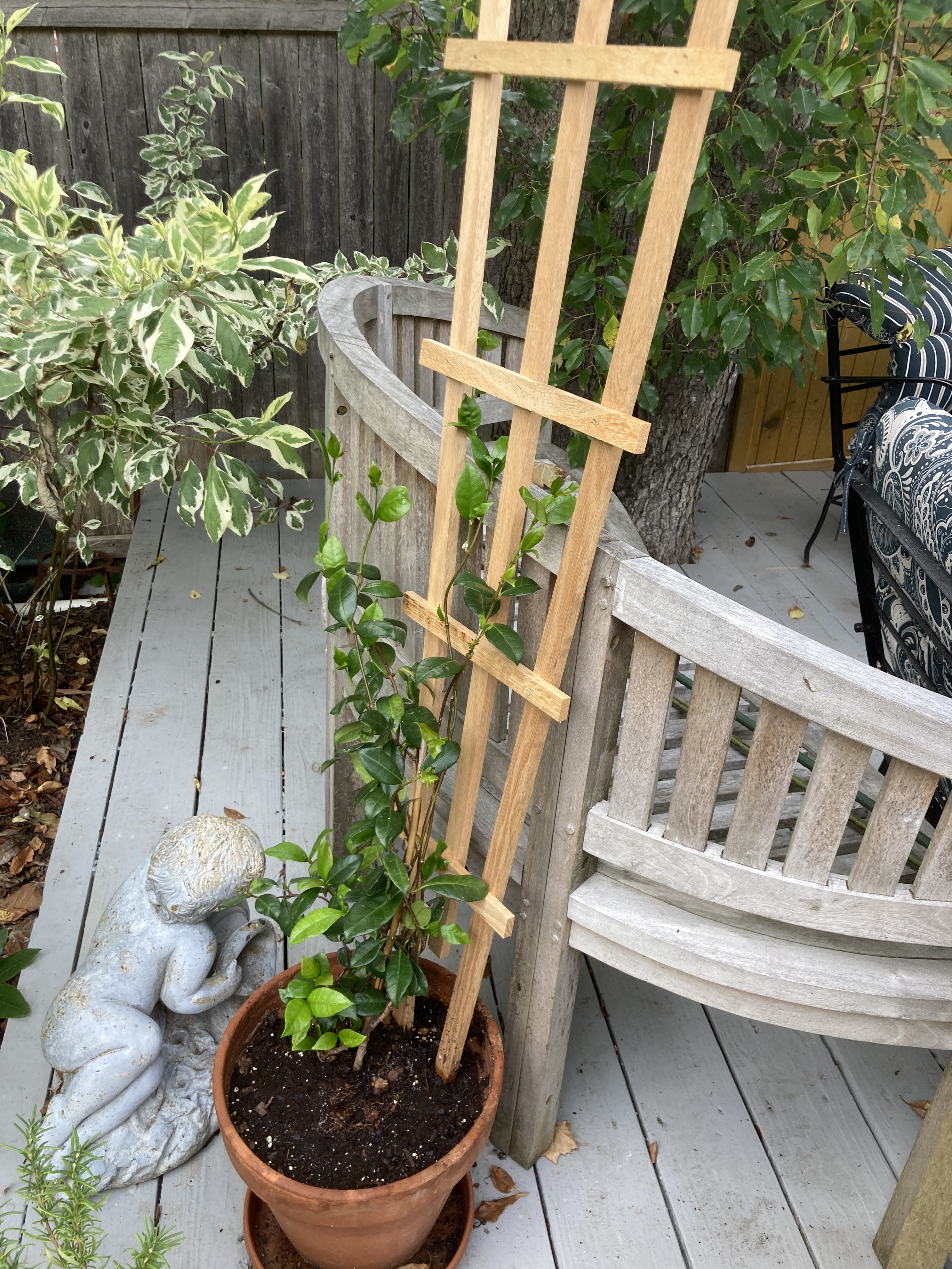 The jasmine plant I wrote about last week seems to grow before my eyes and it is embracing its trellis.