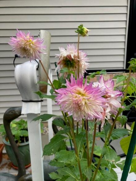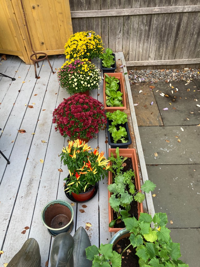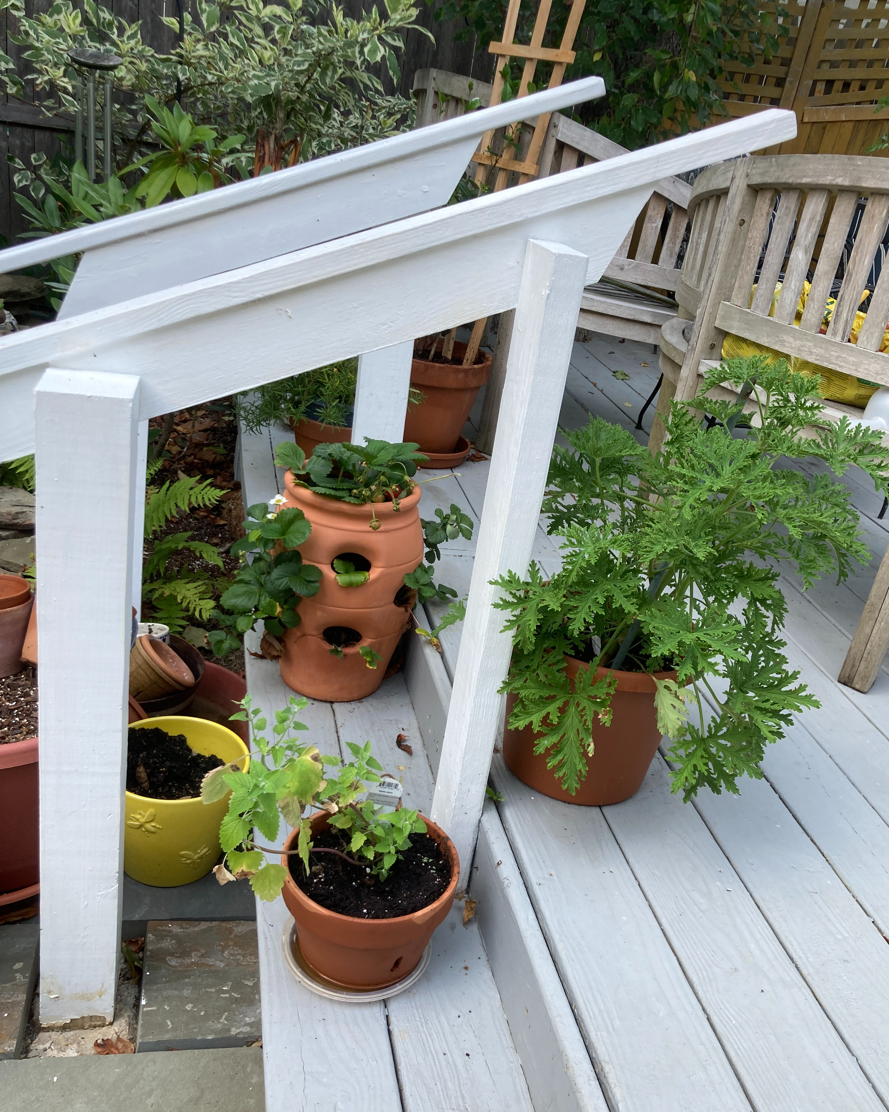 Citronella growing like topsy on the deck (and doing nothing for the mosquitoes!) and an injured catnip plant I just rescued is in front of the strawberry pot. Let’s see what the kits make of that!
