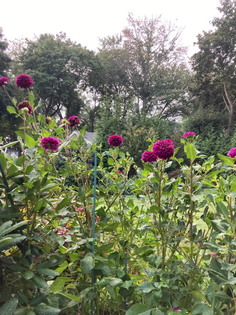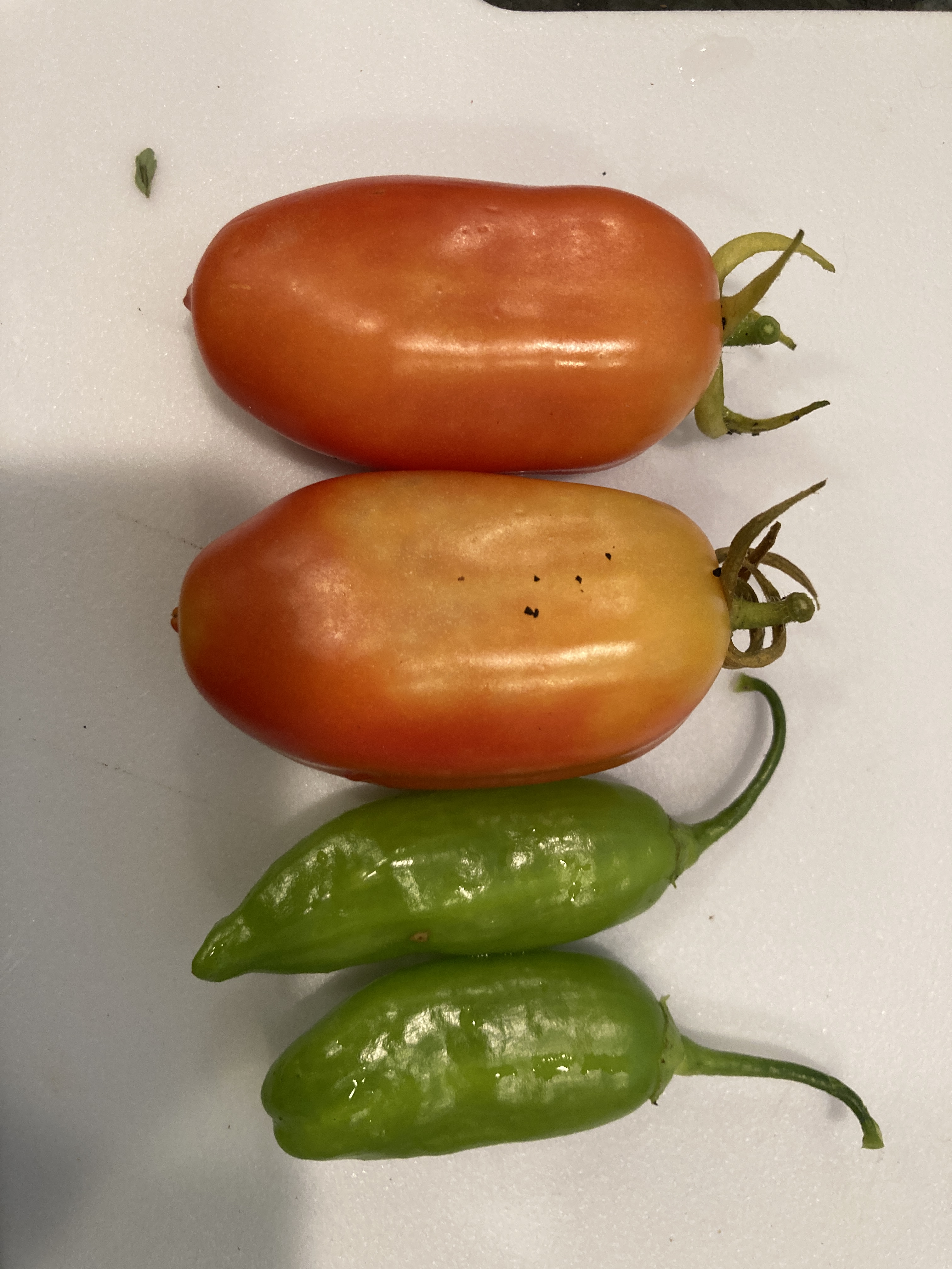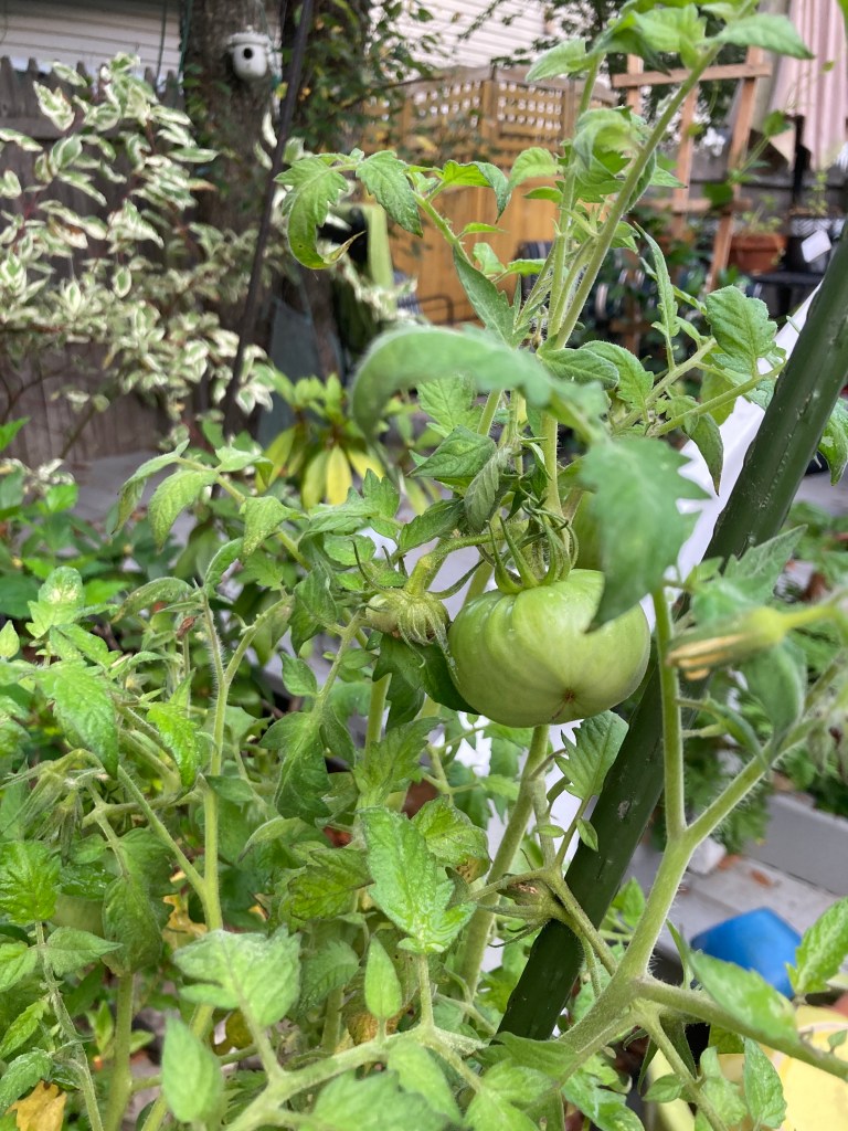 The tomatoes have gone “plumb wild” and are requiring constant staking to help them bear up under the burden of their produce. The tomatoes started out in a sunny back corner of the yard before an enormous bush grew to hide them completely. Luckily it doesn’t block the sun and the tomatoes are growing gloriously.