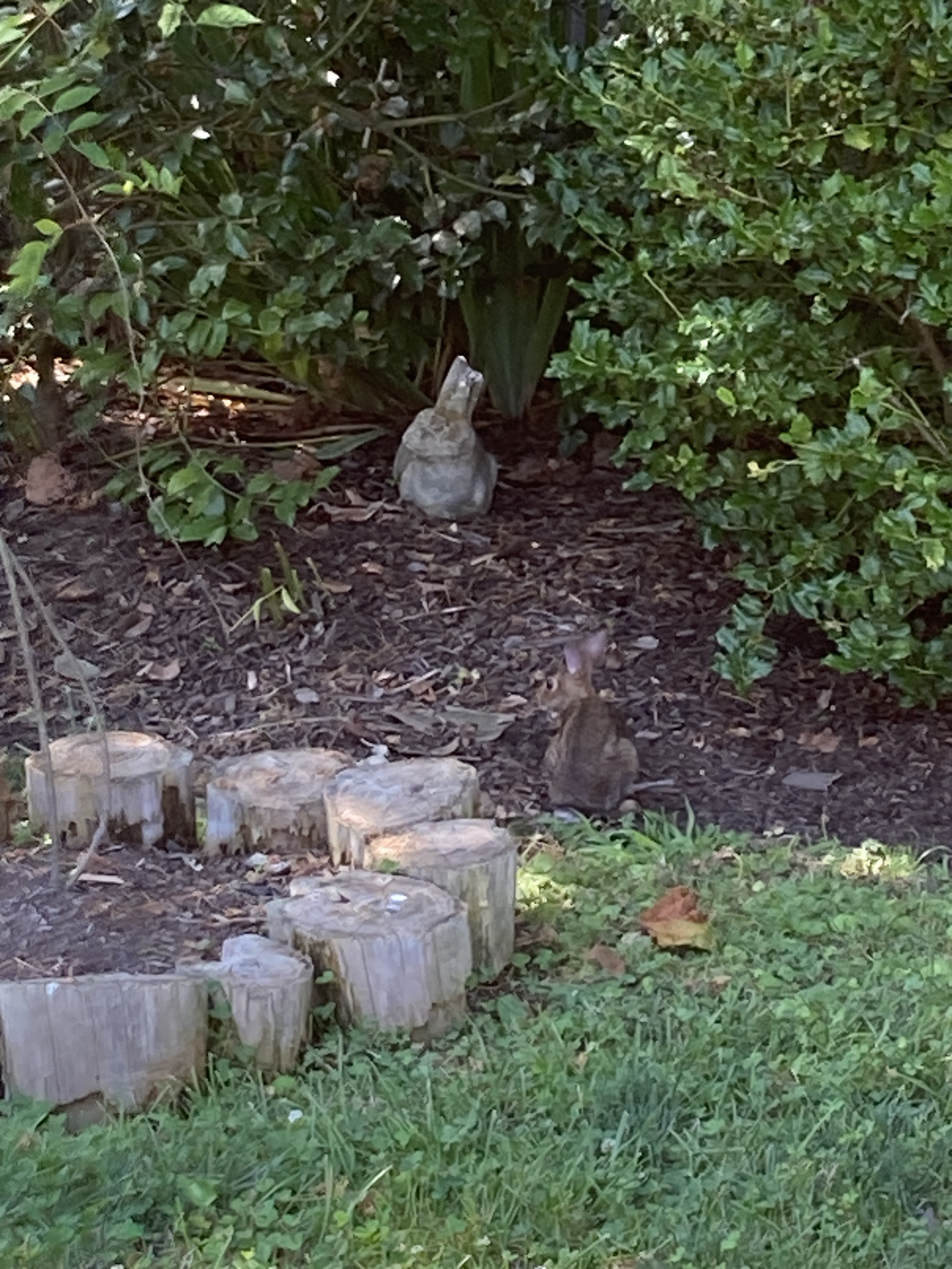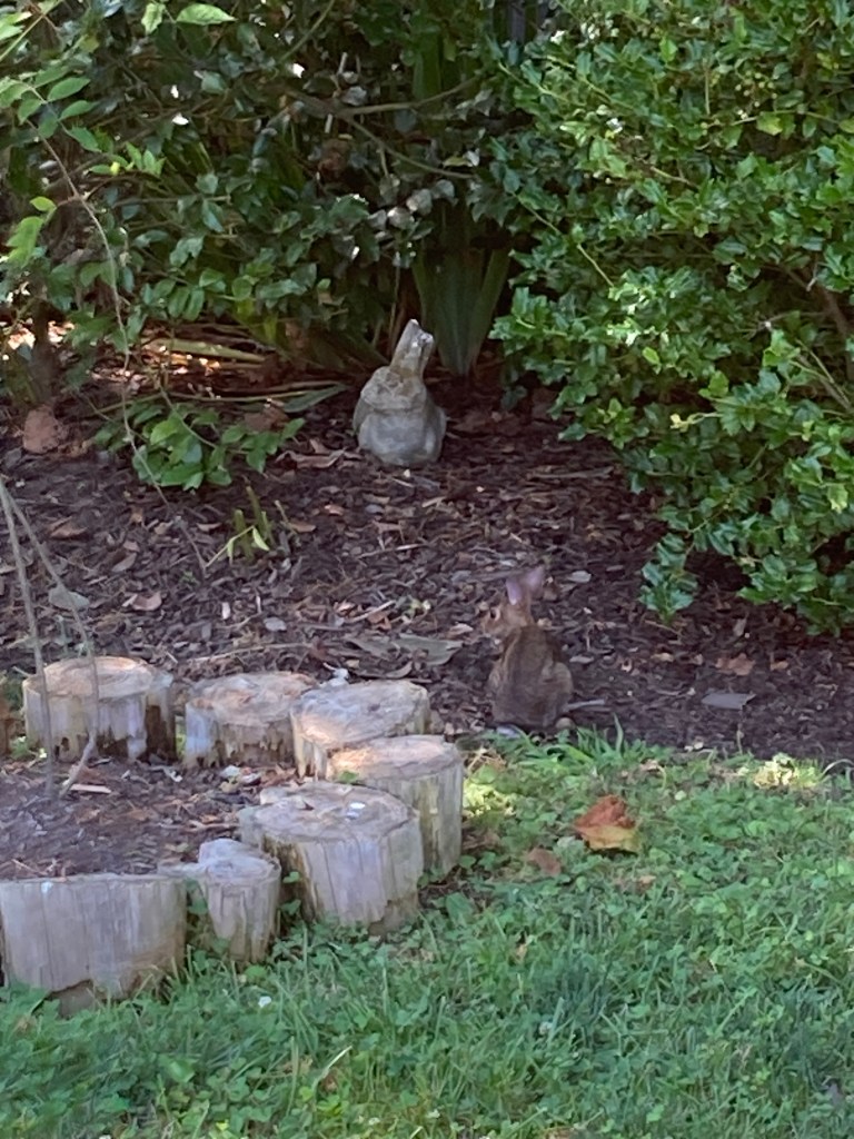 This little fellow has camouflaged himself nicely, near one of mom’s many bunny garden statues.