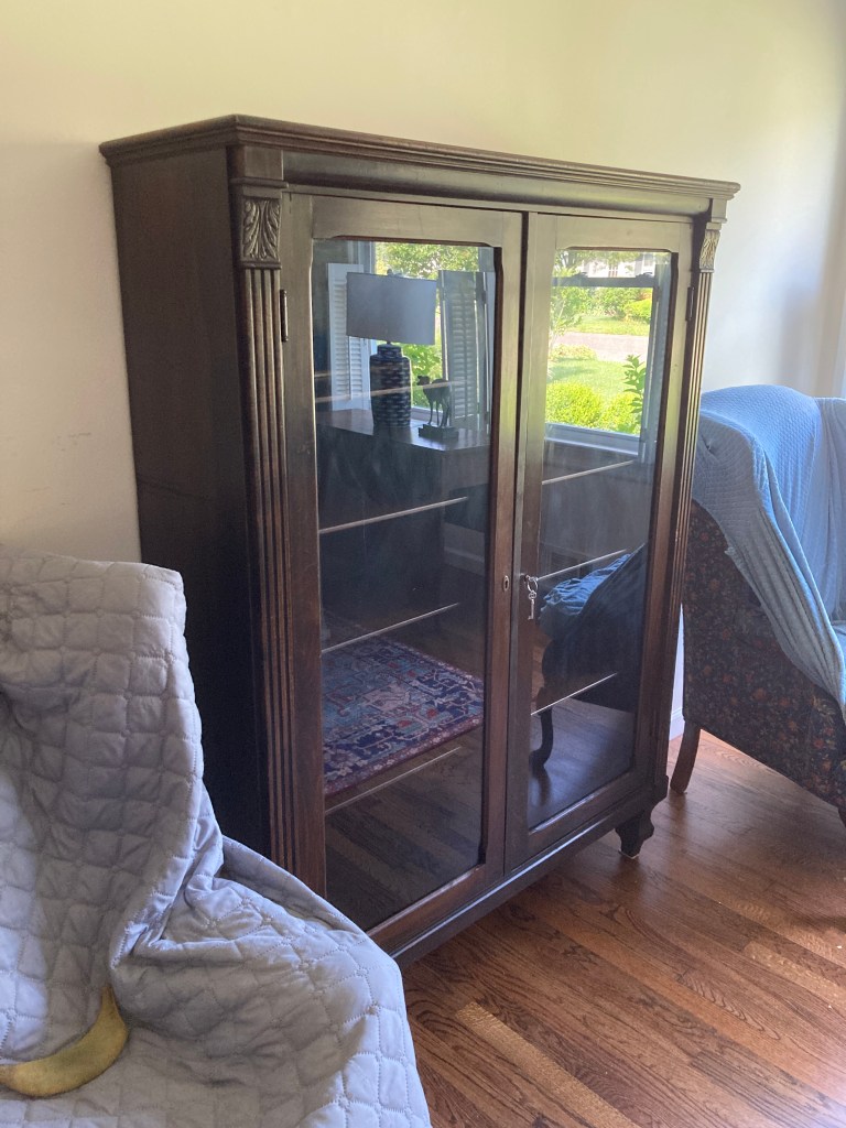 The cleaned up bookcase after considerable elbow grease and help from a friend who had keys made for the locks on the doors which keep them closed.You’ll note the cat proofing on the chairs.