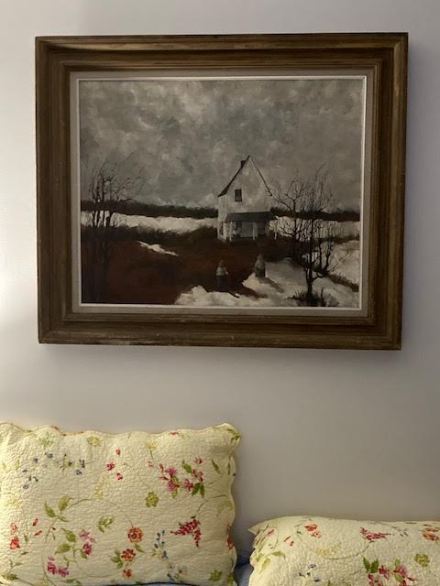 The painting I am posting about today was recently pulled out of a closet and hung over our bed. My mom said it was by Carolyn Wyeth (1909-1994), sister to Andrew and daughter of N.C., which is likely because my dad filmed a documentary on her many decades ago. Dad did most of the art buying and he would have found the opportunity like catnip and he held the opinion that she should have been better known.