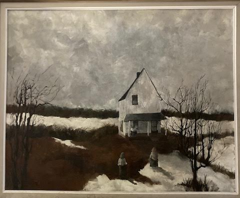 The lack of definition in the figures, bundled up against the snow and the cold, bothered me a bit. I guess I had my critical chops as a small child. But the not quite entirely monochromatic nature of it interested me even then. The tiniest bit of red on the figure on the porch was of great interest to me, long before I would have been able to explain why. The texture of the paint is satisfying, even without being thick.