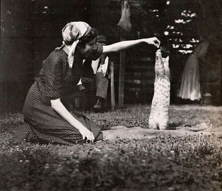 I prefer the earlier card somewhat and it is more than the cat show reference. The composition with the additional sign is a bit better and somehow holding the dog, and even the patterned floor, make it more dynamic. She has a bit of a smile in the first shot and a hat full of flowers – the hat in today’s card notably appears to have a whole bird on it. She wears a different fur trimmed jacket in both.