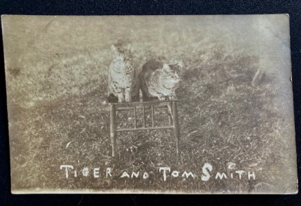 However, most notably the Cat Show Next card has a different, patterned floor, the other one is a plain wood. A very careful look (lower right corner) shows that the copyright for these two cards is a year apart with the cat version being earlier by a year, 1907 although my copy of that card was mailed in 1909. So did it prove so popular they brought out this variation the next year? I wonder if there are more.