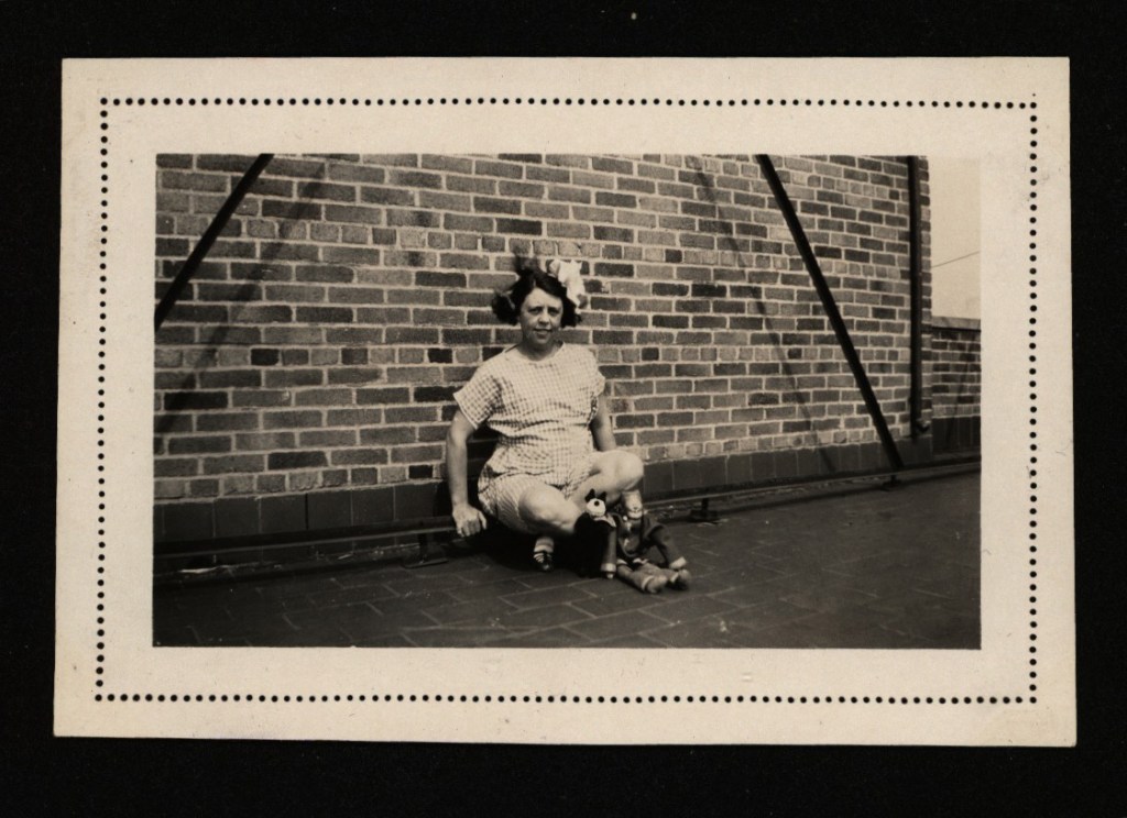 The age of the girl in the photo eludes me as well – dressed a bit childishly, how old or young is she? Of course I myself often pose with my beloved toys so I cast no aspersions if she is a bit older. Her gingham sunsuit and pigtails trimmed with ribbons seem young on her, but that could also just be by today’s fashion. One sandeled foot sporting a striped sock is barely visible. Although it could just be a wall of a building it feels like a rooftop to me, something about it says roof to me. A hot summer day at midday.