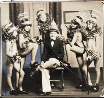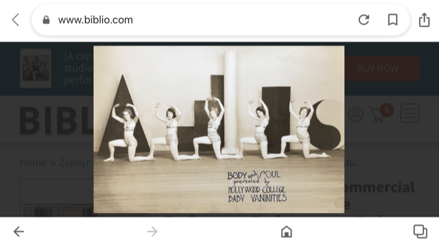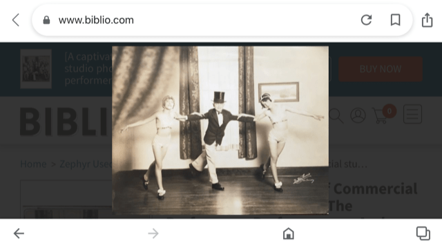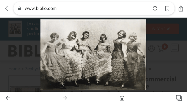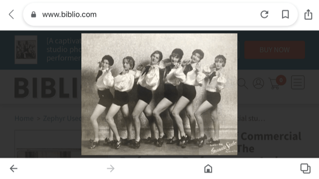 Part of me is surprised that the girls are so gussied up in their costumes while the boy is at center in what appears to be a straight ahead suit and fedora. The room in question is very simple with a painting, the image which is unreadable, a drape covered window and a fern in a standing planter. The wood plank floor looks dance ready though and he seems to be perched on a stool rather than a chair. (A slideshow of the additional horizontal photos from the Biblio.com sale is below.)