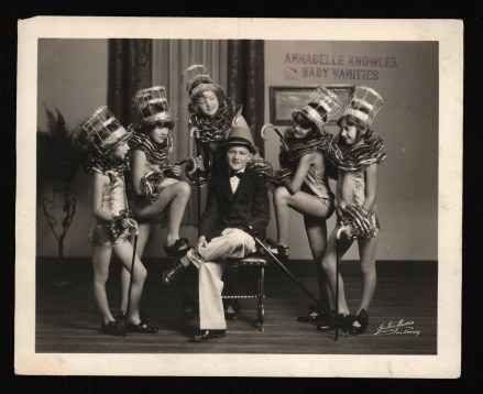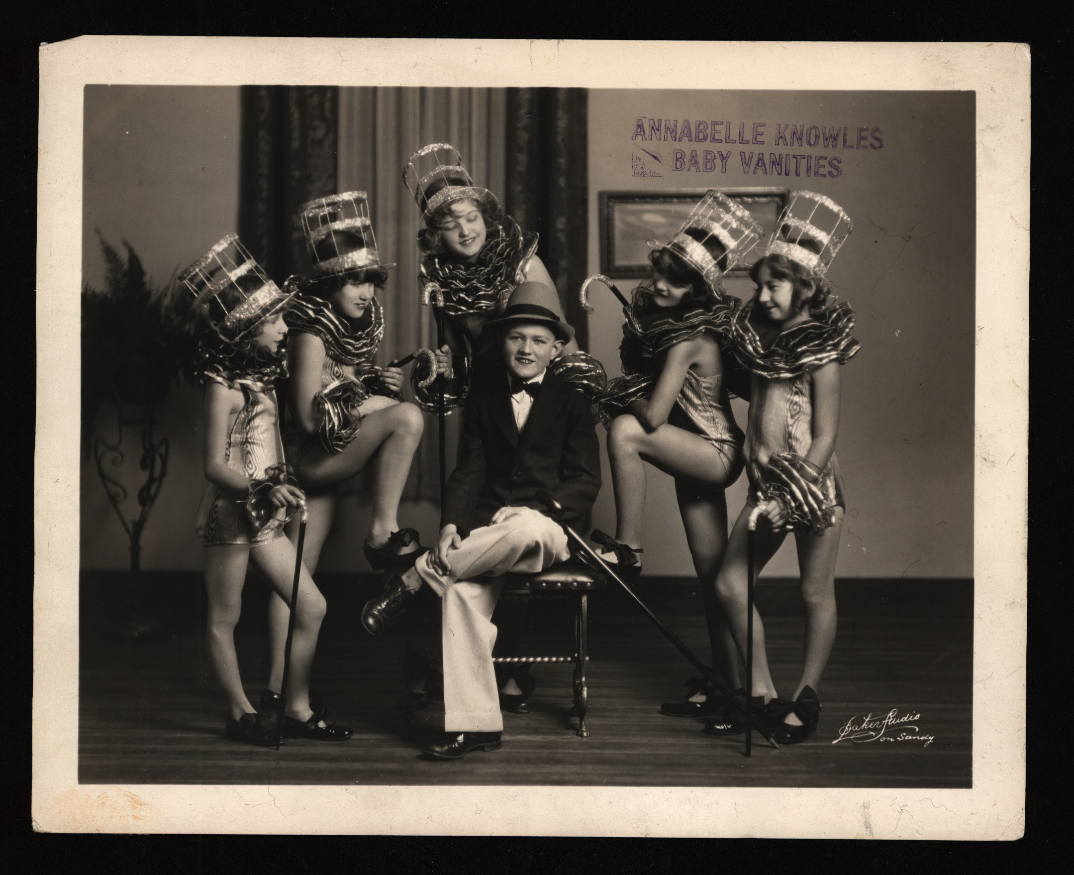 According to the scant information provided it was a Depression era kiddie performing arts school called the Hollywood College of Music, Dancing and Fine Arts. Their information claims that students started at age 6 and reached into the teens and was, as shown, for both boys and girls. Annabelle Gertrude Knowles was the Director of the school. The photo was taken by Joseph Baker of the Baker Studio in Sandy, Oregon. While usually all of this would be enough to turn up further information, the trail went dead with these leads, perhaps because all are of the words and names are too common to conjure this rarefied tidbit of information sought. I assume that some nominal information must have been available with the clutch of photos the seller on Biblio.com has in hand. None of the named performers turn up anything I can find searching either. I did find a single obit which mentions that Betty Ross Abbott was a student at the school, although she went onto a career in real estate.