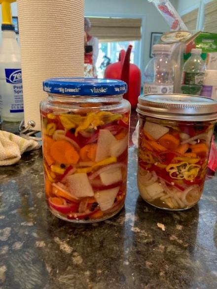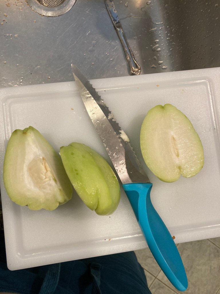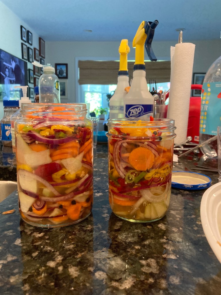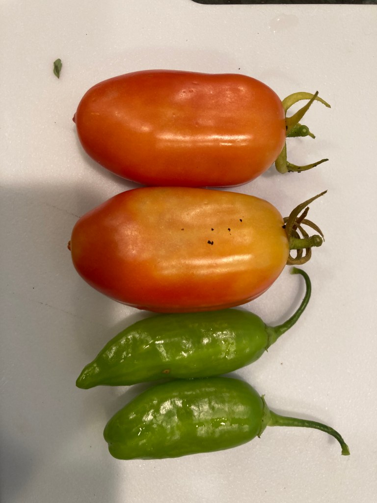 The tomato plants promise produce, hanging green on the vine but ripening SO slowly. Another producing tiny tasty yellow cherry tomatoes is doing a great business – unusually small but tasty bits being the order of the day here I guess. We pop small handfuls in our mouth, still warm from the sun. The jalapeno peppers are bountiful (and perversely huge) and of course are the hardest to use up quickly without killing my diners with devilishly spicy treats.