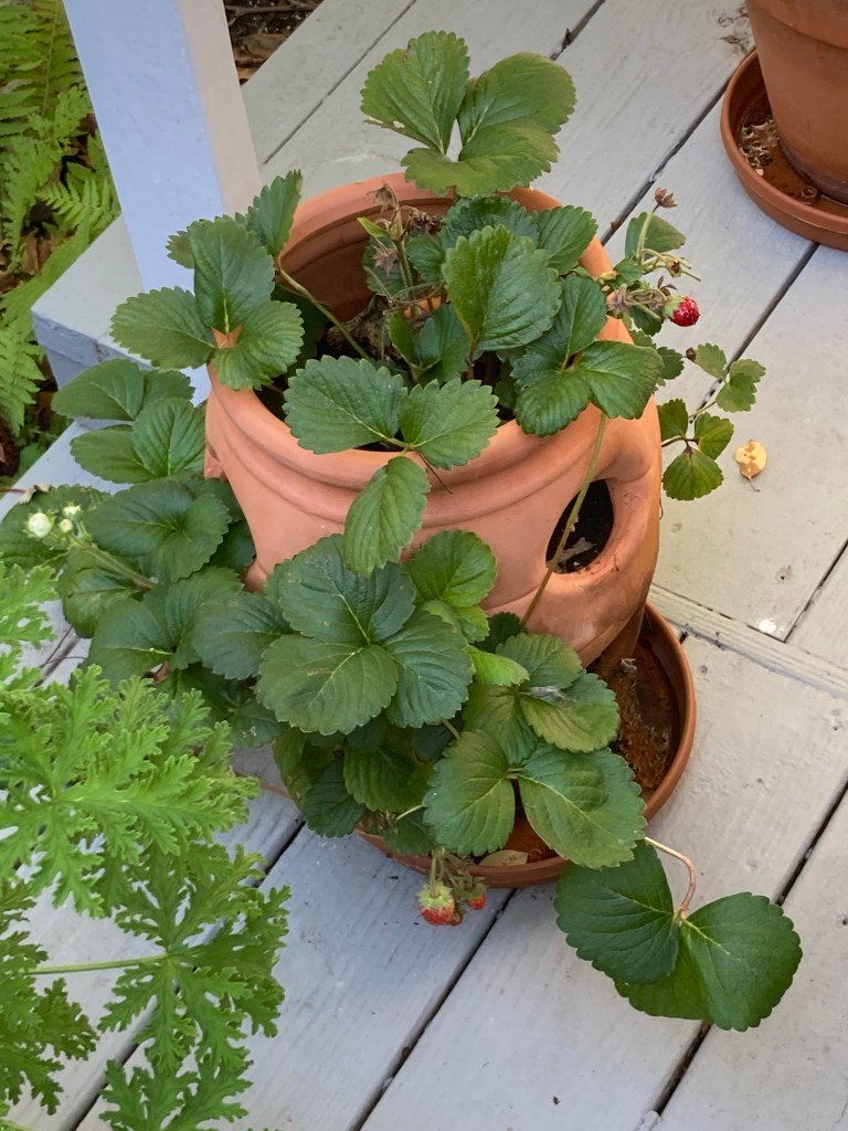 I can almost always find bees tucked in the centers of the dahlias, drowsily, drunkenly and dizzily covered in pollen. The strawberry plants are also enjoyed by the hummingbirds and are overflowing with flowers right now. I think I’ve mentioned before that they oddly produce only the tiniest, almost doll sized fruit – delicious but bizarrely small.