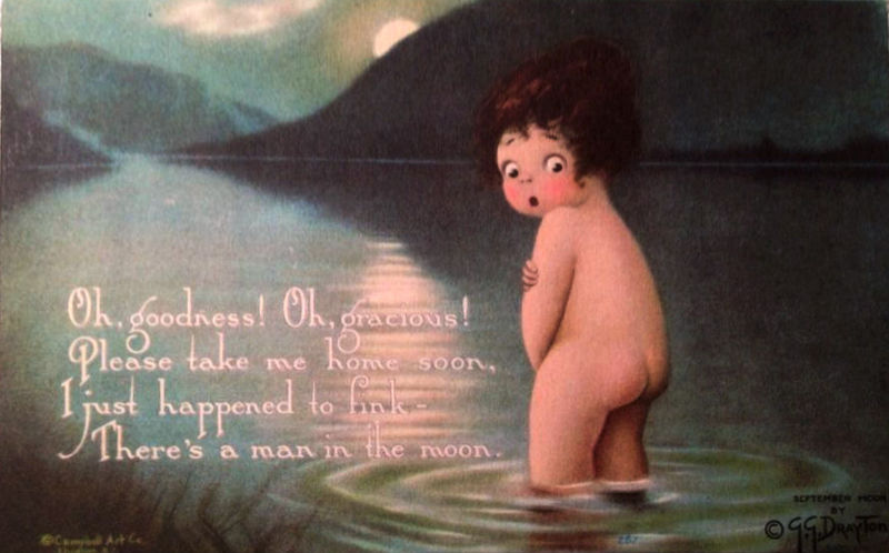 Cuteness seemed to be her professional beat although there is something about her bio which suggests it may have been less in evidence in her personal life. Drayton owns the title of first woman to be a cartoonist for Hearst. She specialized in round faced, chubby child characters and in addition to the comics and commercial work she illustrated children’s books. An abundance of her Campbell Soup Kids and Dolly Dimples work survives (the Dolly Dimples paper dolls proliferated), and Drayton’s work is in the collections of several museums here in the United States and Great Britain. Drayton died young at age 56 in 1936.