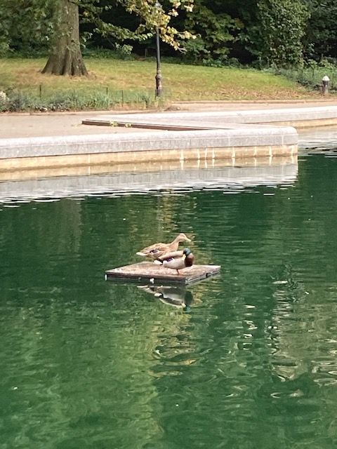 Miniature boat pond in Central Park this week. This pair from a family which hatched early this spring and are now mature. They seem to like this little raft which is sort of funny since they are ducks.