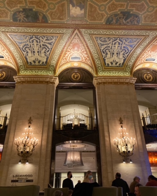 Ironically Chicago was the last business trip I took in February of 2020 (I wrote about an earlier leg of that trip here) and I stayed at the same hotel, the historic Palmer House a few blocks from the Art Institute. I found the hotel still beautiful, but in a somewhat reduced circumstance with no room service and restaurants closed, occupancy felt low. At my arrival time of 8:30 at night I was barely in time to grab a quick sandwich at the bar. (There was a Grab & Go take out with some sad food and no one to pay – truly grab and go I remarked to a fellow traveler who spontaneously revealed that he hadn’t been out of his house in two years. I assume he meant travel?) My room was clean, but no cleaning staff in evidence which was fine for me, but unusual.