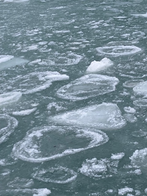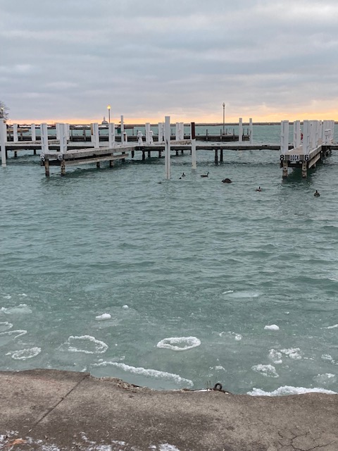 The Beaux Arts buildings dot this horizon in one direction, the more contemporary skyline in the other. A Ferris Wheel in the distance, by what appeared to be a cruise ship made me think of a young adult novel I read years ago about the history of the Ferris Wheel and its origins at the Chicago Exposition of 1893. Kim had suggested it called, The Great Wheel, was written and beautifully illustrated by Robert Lawson in 1957. I highly recommend it for all ages. Cakes of ice floated around, ducks took them in stride.