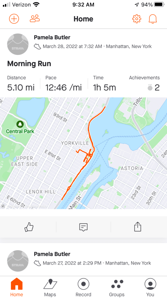 Time with my mother in New Jersey passes at a different pace too. I find myself examining that time which also slows it down. Morning coffee with her is a good time and I savor it. Running in her suburban neighborhood takes on a somewhat magical quality and the same five miles seems more epic there than my trot up and down my also beloved East River at home.