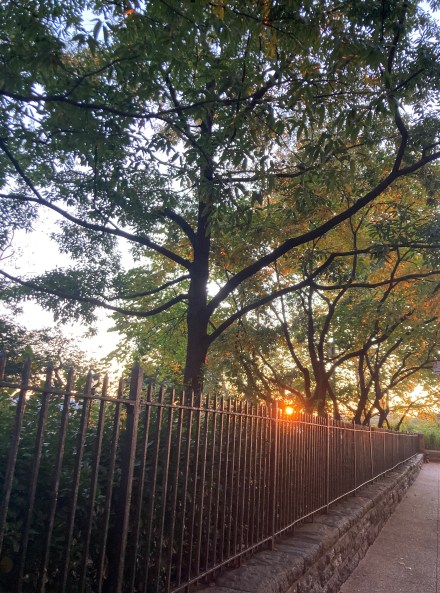 Meanwhile, speaking of sports, last weekend enjoying the first lovely cool morning for running in a number of weeks I was feeling great until I fell just as I was reaching mile 8 on a run that would have been my first approach on 9 miles. A bit bloody, but luckily not badly hurt (nothing broken and a thank you to the runner who helped me up and the gentleman drinking ice coffee on a bench who even gave me ice for my hand), I ran home and still recorded 8.8 miles. However, it has kept me sidelined this week while my knee fully recuperates, as well as my hands, one of which took the brunt of the fall. Therefore, I found myself walking to work on Wednesday, through Central Park when I had my back-to-school moment. The light was pure September and the trees are just starting to consider embarking on their winter waning.