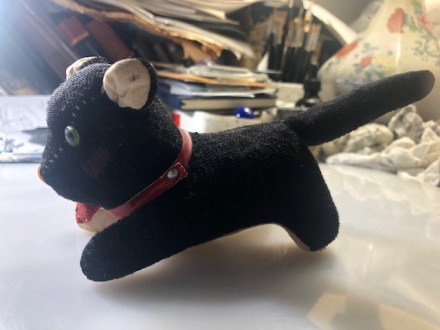 Interestingly, a note came with the sewing kit and it reads, Dear Ms. Butler, Thanks for bidding on this unusual cat sewing kit. My best guess is that it was acquired by my mom, who was born in Berdstown, IL 1921. I hope you have a collection of eccentric objects to which this is a welcome addition! Julie Johnson. I am anxious to introduce Julie to the Pictorama collection which I think I can fairly say houses its share of eccentric objects. I will keep her note with it – I love knowing a sliver of history associated with it.