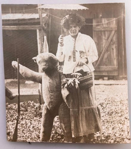 It wasn’t for the man in drag I purchased this photo, but for the very large, marvelous teddy bear, who stands on his haunches and bears arms! He comes up to the man’s elbow.