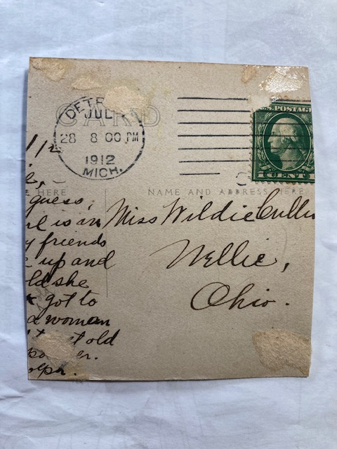 There is writing on the back and it was mailed. The cancellation survives and it was mailed from Detroit on July 28, 1912 at 8:00 PM. It was mailed to, Hildie Cullen (the name cuts off here), in Nellie, Ohio. A few words exist down the side but not enough to string together, it was a dense note of sorts.