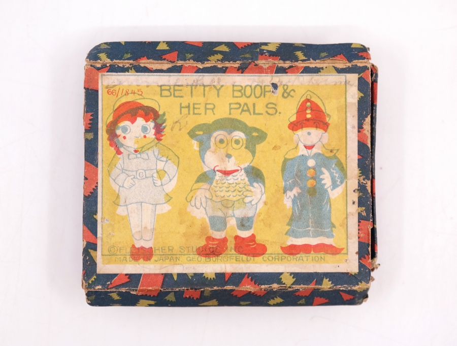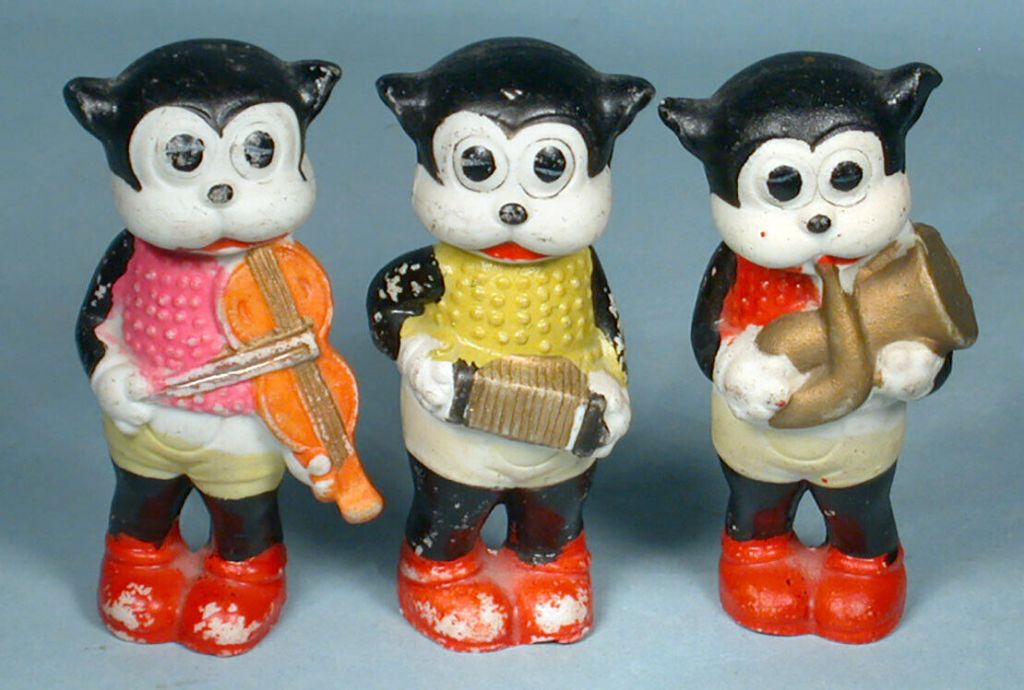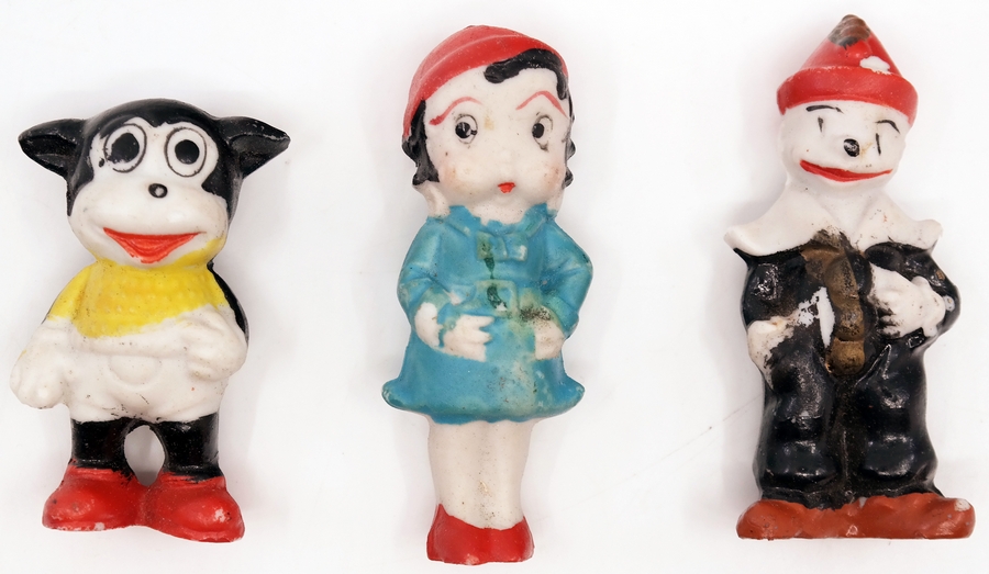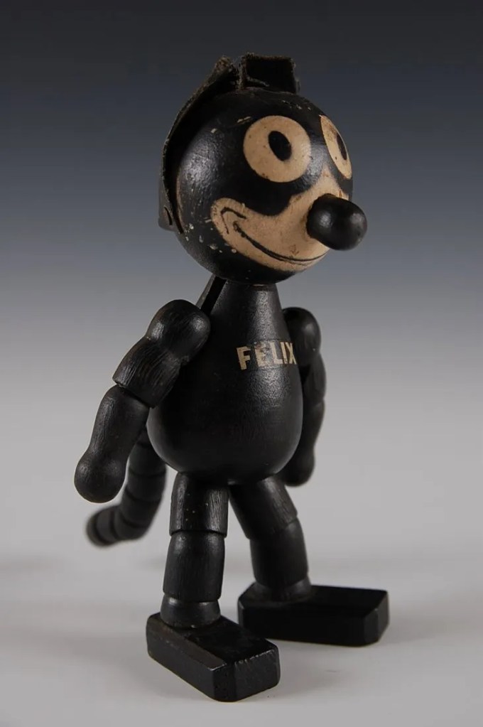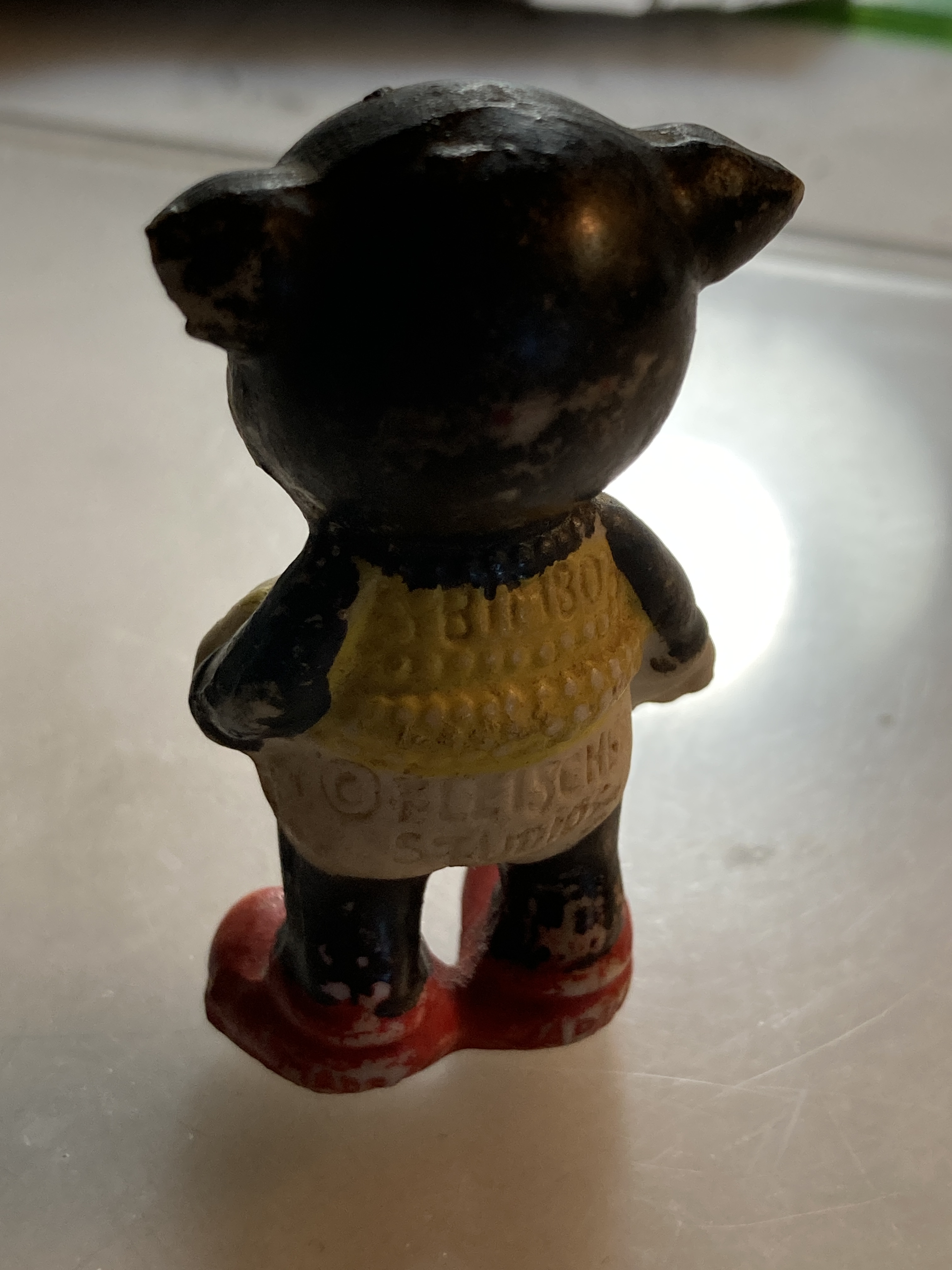 Our new fellow has a place of pride among the kitties (alongside a tin pigeon, some Donald Ducks and the aforementioned canines) on a shelf in the big bookcase of goodies. A tiny but very entertaining addition to the Pictorama and Deitch Studio family.