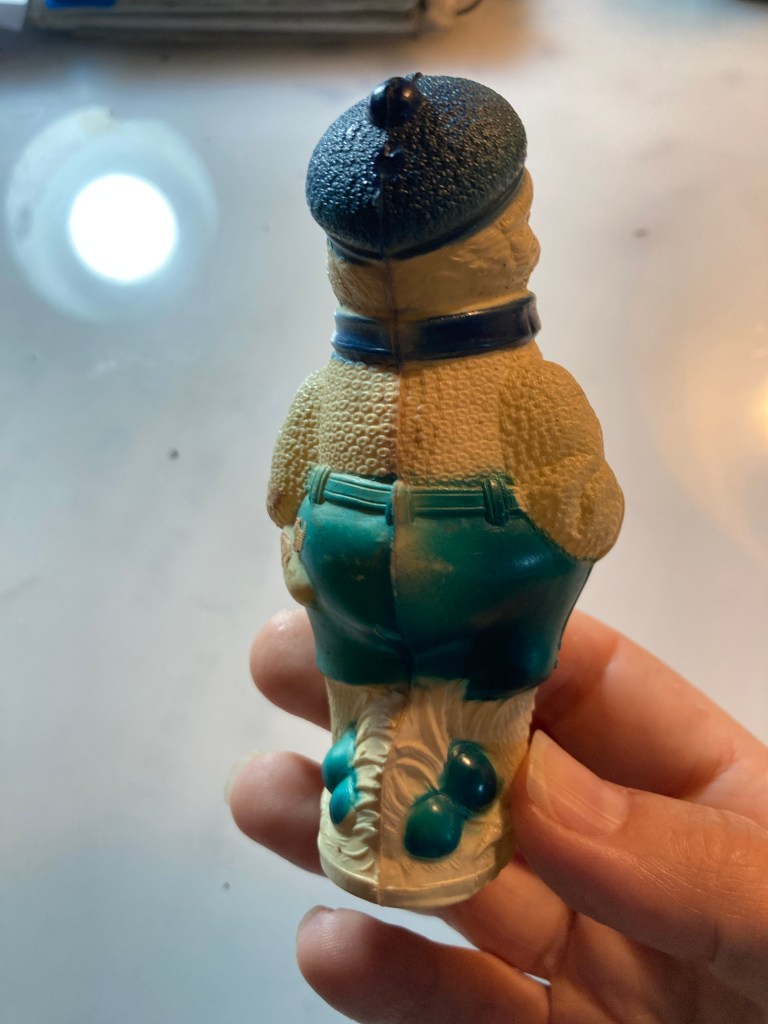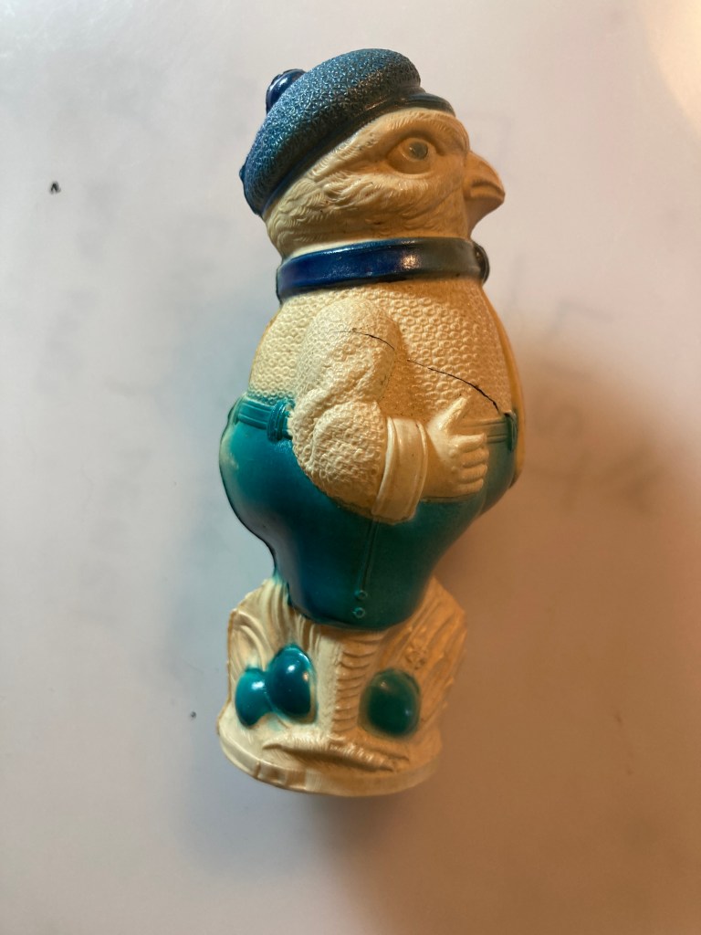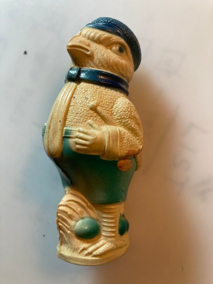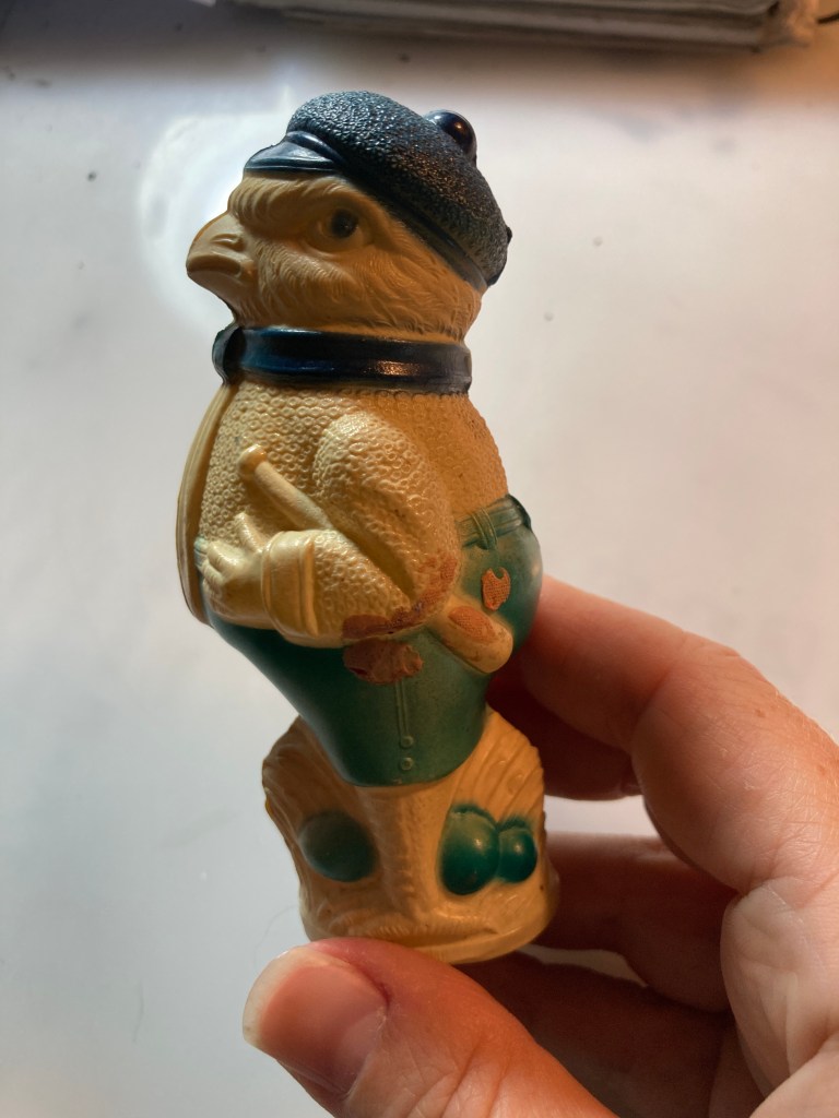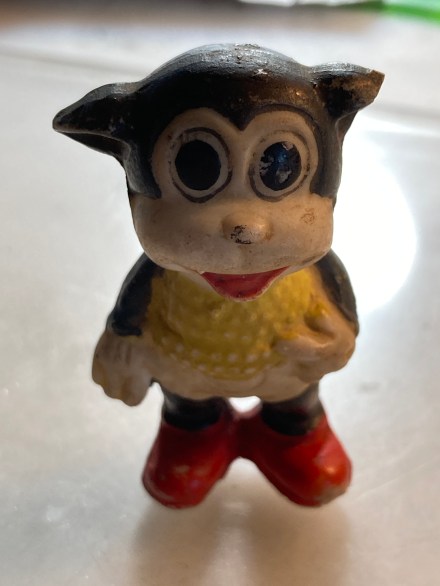 Pam’s Pictorama Toy Post: As promised, the New Year parade of toys continues. Today’s is a lucky find post. I can’t even remember what I was looking for or at when this little fellow popped up on the bottom of my eBay screen and caught my eye. I was in bed, doing a casual weekend eBay scroll as is my wont, when I spied him. I showed him to Kim and we agreed that he was a purchase.