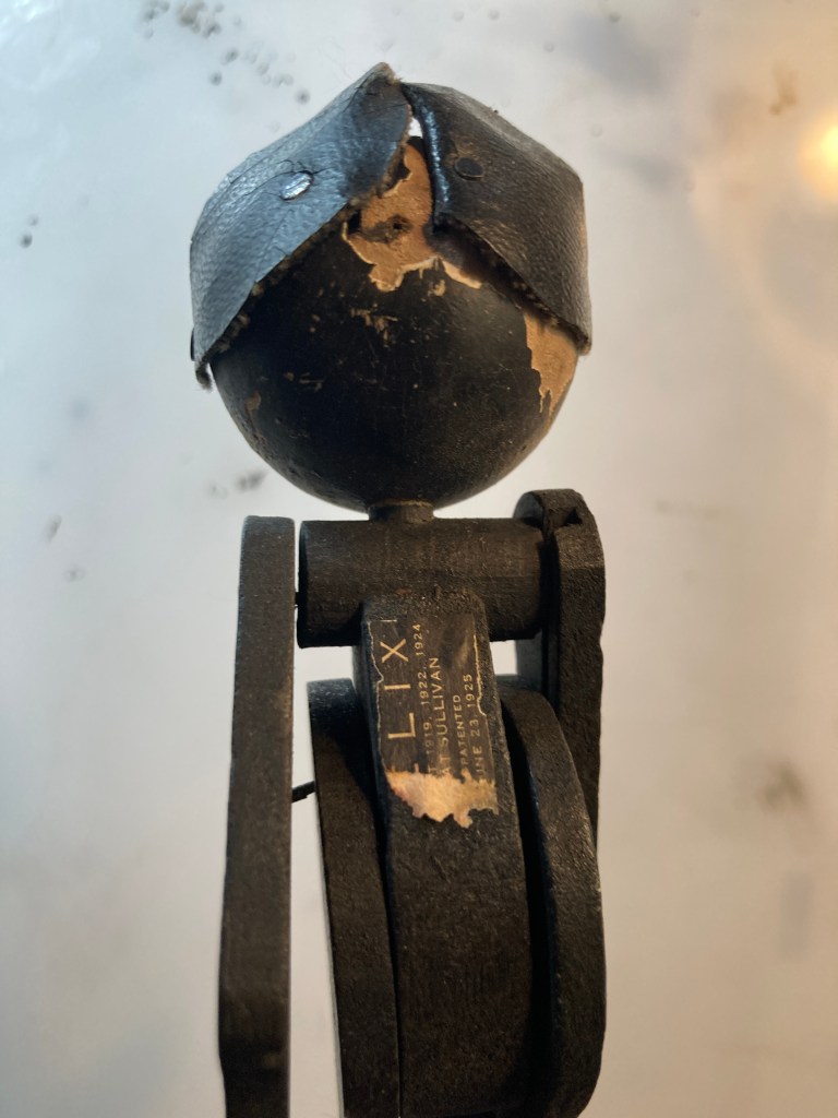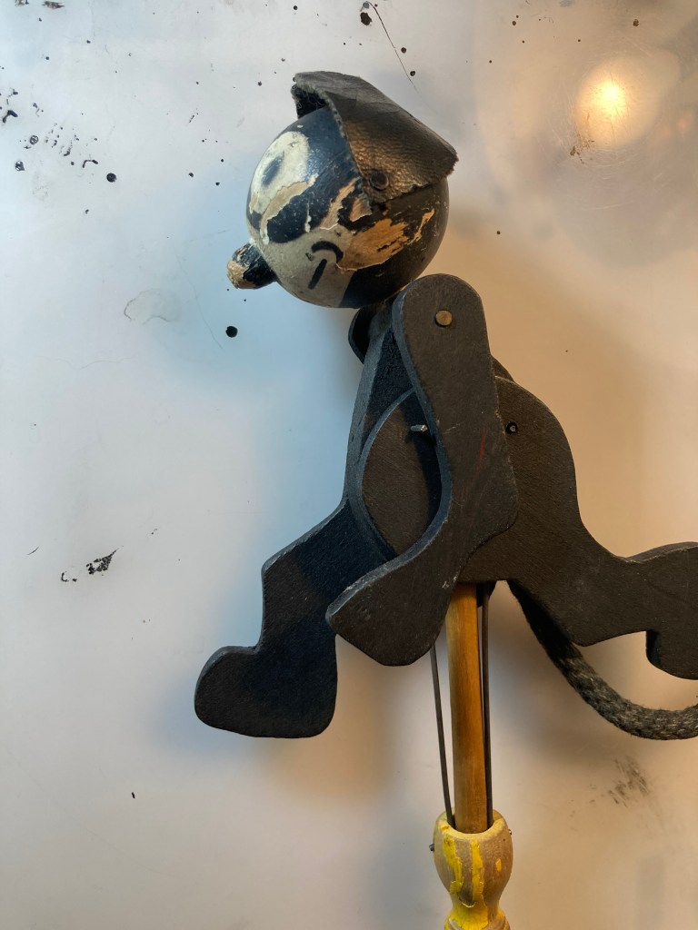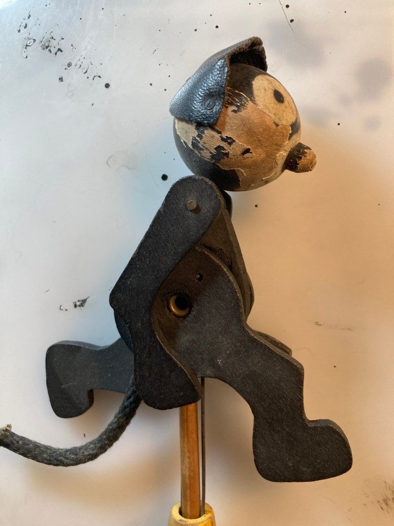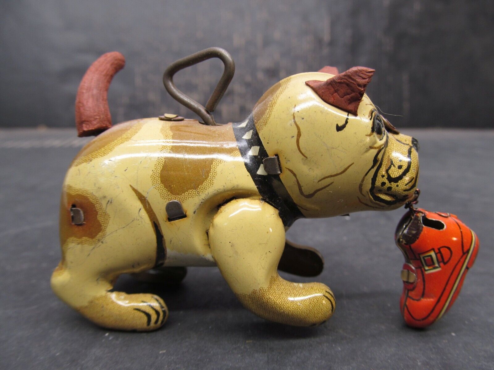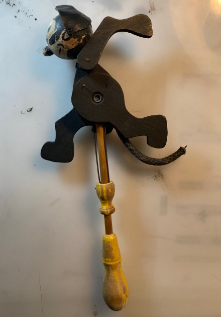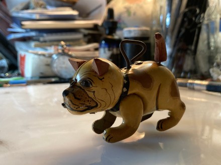 His trick, as you can see, is that when wound his tail spins around – a fairly straightforward motion. Further research shows that he originally had a shoe in his mouth! When I looked, sure enough there is a little hook in the corner of his mouth to hang it from. Ha! It does crack me up. (The concept and the motion is similar to another tin dog in my collection, shown above. A post can be found here complete with video motion. There is also another tin dog that coughs up tiny balls which can be found here. You see, we do have our dog days here at Deitch Studio.)