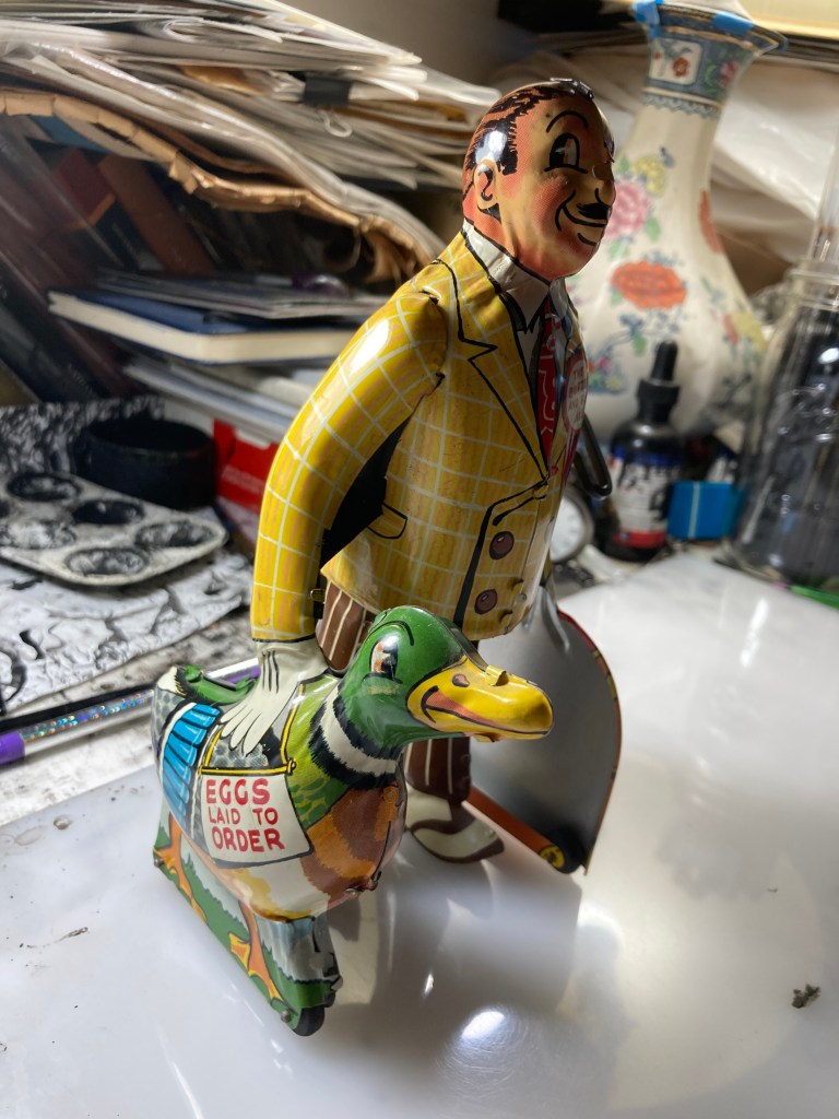 Meanwhile, many of my actual toys make an appearance. My Butter and Egg Man (read the original post here) has a nice bit of real estate and figures prominently on one side of the drawing. (It is he who has come to town after all!) His suit is a bit more zooty in the drawing than below – bright red stripped trousers and Kim’s version wears a hat which is also a nice addition. The tune of Butter and Egg Man blasts out from a wind-up phonograph at his feet with bits of the lyrics around him.