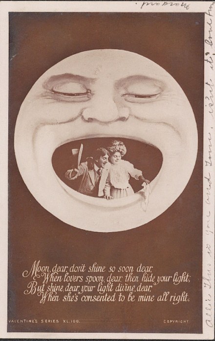 The cat and mouse card caught my eye early – there was something truly feline in the way this puss studies the mouse (a mousy looking mouse despite her anthropomorphic portrayal) and she seems is dancing in a strange little holiday dress. My valentine is written across the dress, with a little cheat of the nt in order to make it fit neatly. A nod toward the crueler side of feline nature is a bit surprising in a Valentine sentiment, You look sweet enough to eat. This cat means it folks, a bit of blood lust in his eyes. Nonetheless, it was sent To Jean From Lorraine as per a very childish pencil script on the back. We’ll assume it was taken in the best spirit meant.