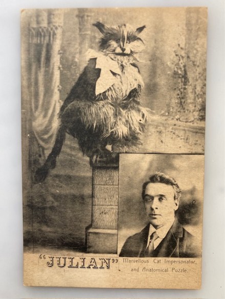 Sadly there are no easily found tracks about Julian and his cat act. As Kim pointed out and I must agree, there is something still very much of him even when he dons his cat costume. I find that he includes a photo of himself sort of interesting and he’s a rather intense looking young man here. Under his picture it says, Marvelous Cat Impersonator and Anatomical Puzzle. I really do wonder about the anatomical puzzle part – what could that mean? Was he able to execute uniquely cat like motions and poses? Amazing dislocation of joints? Did he perhaps sport a tail? (Now that would be something!)