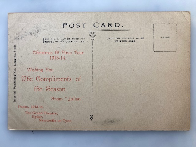 The back of the card reveals that this was actually a Christmas greeting and (in red) reads as follows: Christmas and New Year 1913-14/Wishing You The Compliments of the Season. from “Julian” Panto, 1913-14. The Grand Theater, Byker, Newcastle-on–Tyne. The card was never used and there is nothing written on it.