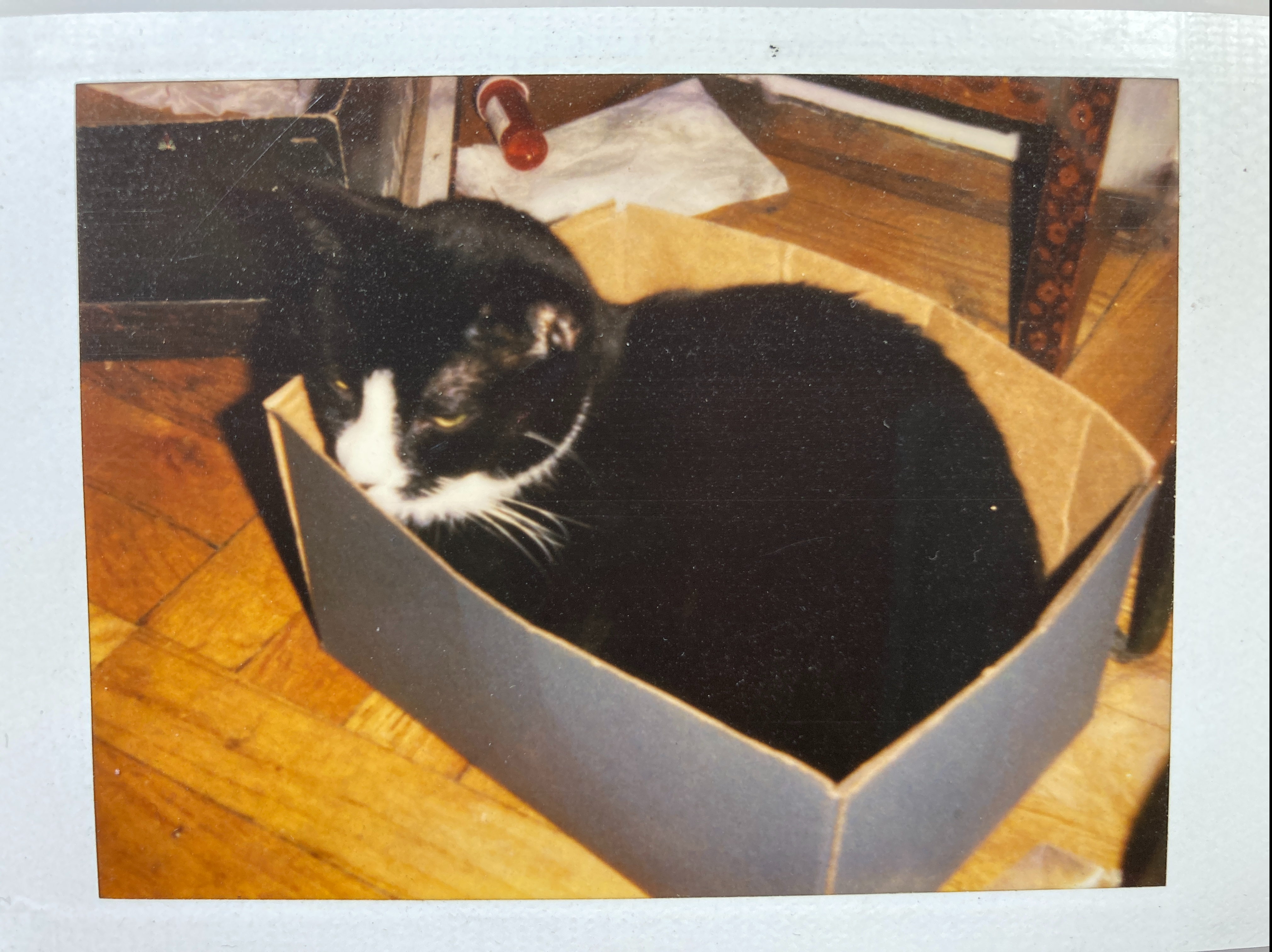 A polaroid of Zippy as a kitten, curled up in an envelope box.