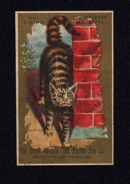 Pam’s Pictorama Post: This is the only Victorian trade card I own of this variety. It is a bit hard to see, but the top says, Ha! Tis Me. The Maltese Me Rival. I do not claim to understand it – I just liked the image of this great frowning striped kitty forced into this very flat perspective – look at his claw paws and an angry puffy tail! On the back, in tiny type, is an exhaustive list of The Great Atlantic and Pacific Tea Co.’s Branch Houses in the U.S. – with almost a third of them in New York City – and a notation at the bottom that the Principal Warehouse, 35 and 37 Vesey Street, N.Y.  P.O. Box 4233. It is a tiny card, about the size of a playing card.