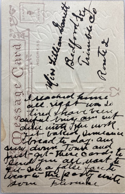 The card is addressed on the back to a Miss Lillian Garrett, Bedford St, Trimble, Colorado, Route 2. The note is hard to read and seems to convey that the person writing (Florence?) got home safely, is tired, baked bread – she wants to get a false face to wear to the party – which in my mind is a sort of odd way of saying she is buying a mask. It is a bit mysterious that the card is addressed, but there is no postage or postmark. Perhaps after preparing it she decided that this handsome card deserved to go in an envelope after all, helping to preserve it for us all these years later.