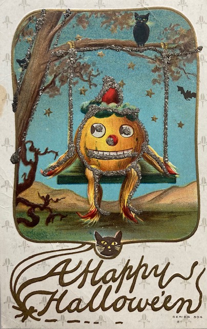 Another kinda scary pumpkin head – this is a candy container I wrote about after purchasing back in the summer. Pams-Pictorama.com collection.