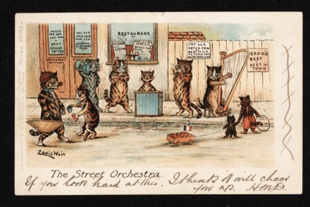 Meanwhile, today’s card is a Maurice Boulanger design, A Gusty corner in Catland. It was sent on March 25, 1904 from Newcastle-on-Tyne to Miss L. Poppleton, 19 Henry Street, Sheildfield. So I think it was a card appropriate to the weather there and then. The note on the back simply says, Dear Lizzie, Do not come tonight as I have to go straight home. come in on Wednesday if possible. Nellie XXXXX. Amazing to think of a time when there were enough mail deliveries in a day that you could send such a note with the expectation it would get there in time! It was the text of its day.